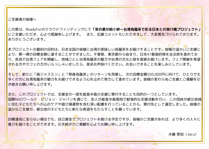 【資金の使途について】 ① 日本全国(47都道府県)を巡り、各地のカフェや飲食店で「台湾烏龍茶試飲会・限定台湾フェア」の開催を通して、美味しい台湾烏龍茶と共に、健康と笑顔をお届けします。このためのイベント会場代や旅費に資金を充てさせていただきます。 ②皆様からのご支援でいただいた資金の11%は、国際NGOワールド・ビジョン・ジャパンを通じて能登半島地震の支援に寄付いたします。 ※「国際NGOワールド・ビジョン・ジャパン」を通して支援を行うこと及び名称掲載の許諾を取得しております。 【スケジュール】 2024年2月07日:プロジェクト募集開始 2024年3月22日:プロジェクト募集終了 2024年3月下旬:順次リターン発送開始予定