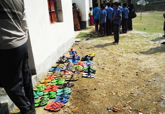 (ランチルームに並んだサンダル。2校目からは教室で食べるように。)