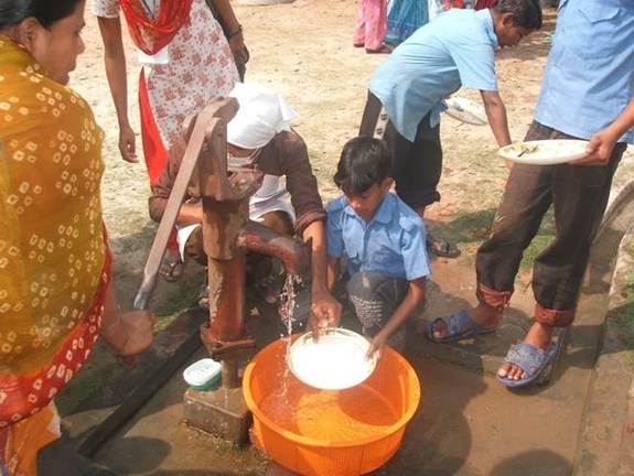 (1本の手押しポンプで並んで手を洗う)