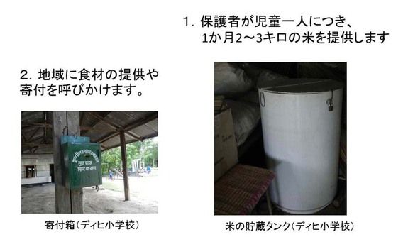 そして自立することを目標に、保護者には1か月2~3キロのお米を持ち寄り、学校給食の食材として使い、また残った分を売って、専用の口座に貯蓄していくことを呼びかけ、地域住民には寄付や食材の提供を依頼することで、スタート時から3年目の自立に向けて準備をしています。