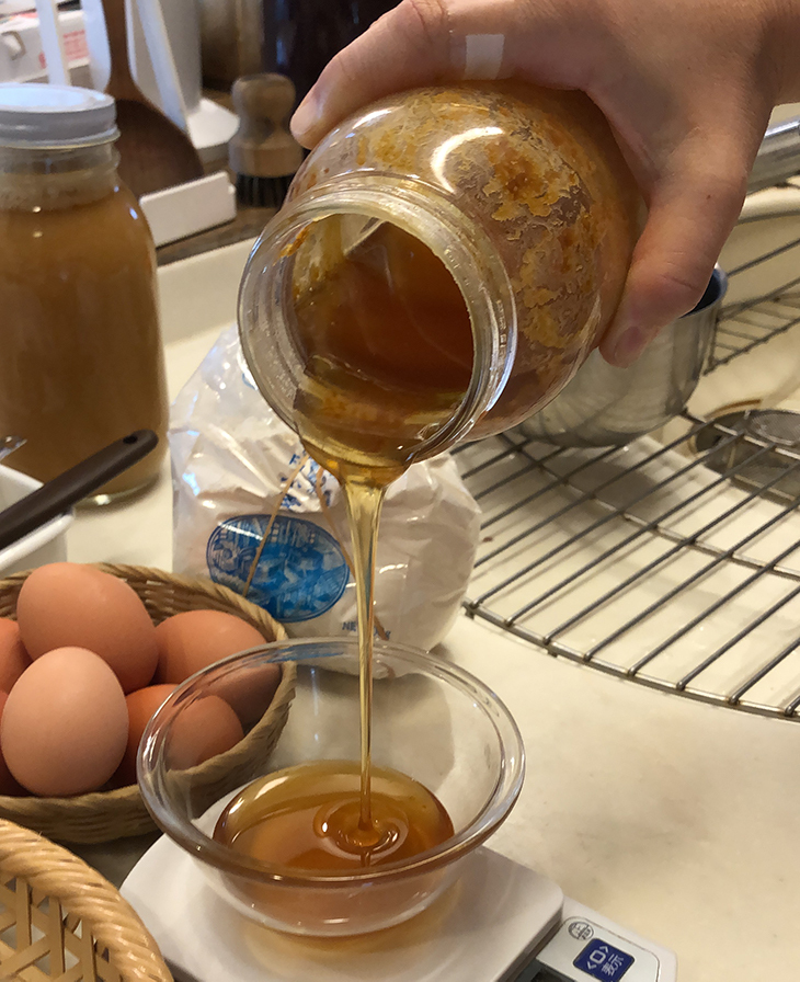 そして勿論、JBeeFarmが生産する無添加、無給餌(無抗生物質)のニホンミツバチの純粋生ハチミツも贅沢に使用します。通常、カステラはしっとり感を出すため、みりんや水飴、ハチミツなどを加えますが、ニホンミツバチのハチミツの味をカステラにそのまま表現させるために、みりんと水飴は使用せず、シンプルにニホンミツバチのハチミツだけを使用します(今後の開発状況によってはレシピは変更する可能性があります)。