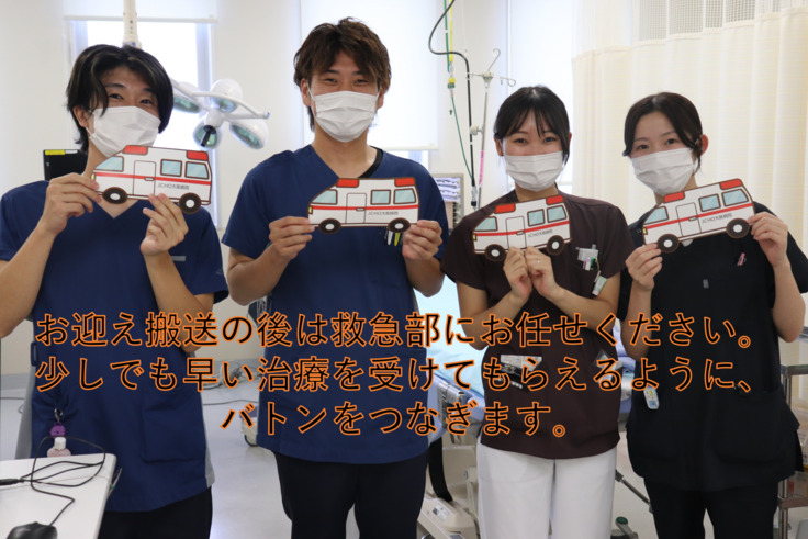 お迎え搬送を行う救急車の救命士より患者さんの状態についての連絡を受け、受け入れ準備を進める救急部。少しでも早く処置対応ができるよう、密な連携を行っています。最近、お迎え搬送の要請が増えている中、出動中などでお断りせざるを得ない案件があります。地域の皆様にとっていつでも利用頂けるお迎え搬送でありたいと、クラウドファンディングを頑張っています。ご支援宜しくお願いします。