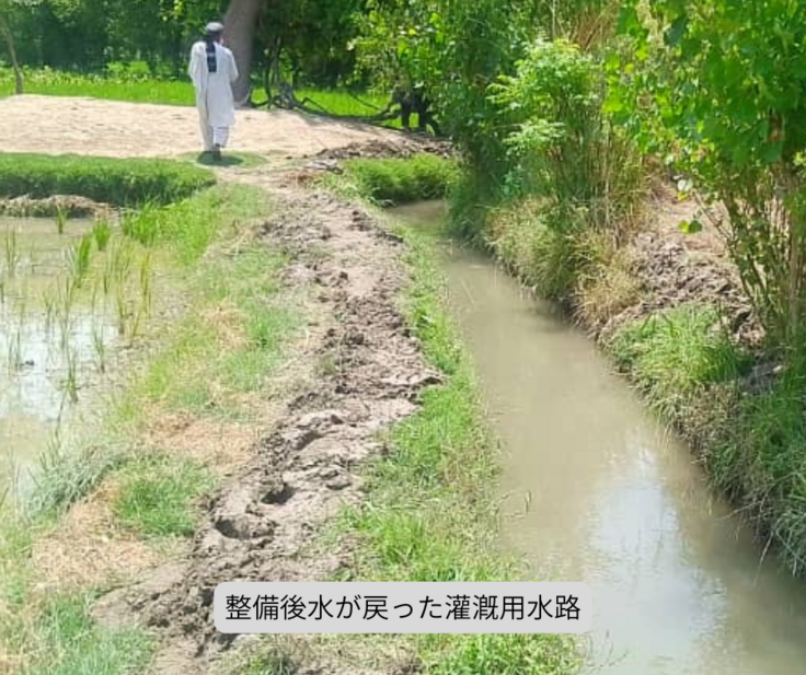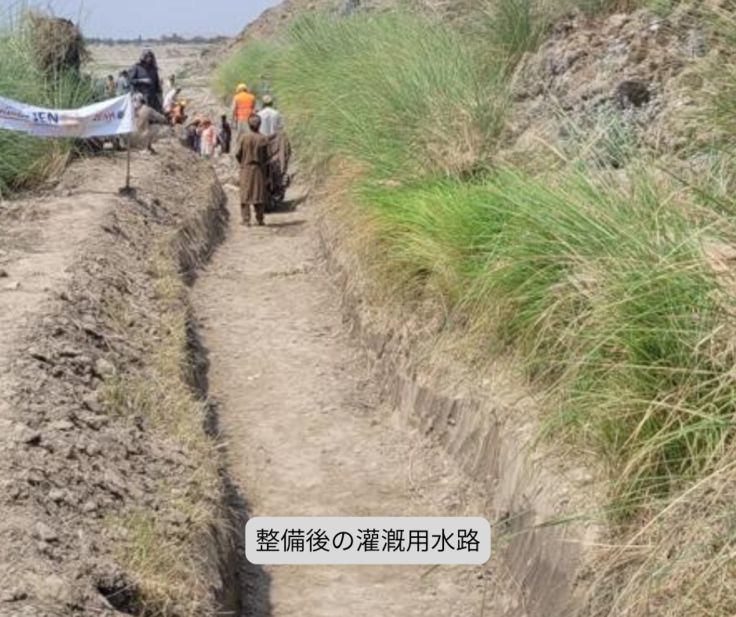 写真は、灌漑用水路を整備する「フード・フォー・ワーク」の参加者と、整備前と整備後の水路です。