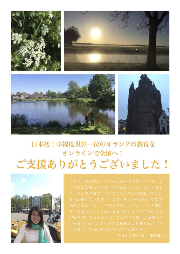 昨年4・5月に行いました「日本初!幸福度世界1位のオランダの教育をオンラインで全国へ!」のプロジェクトに多大なご支援をいただき、本当にありがとうございました。