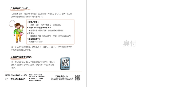 ↑奥付ページには、主人公の情報を掲載するとともに、保護者や支援者向けに、より詳細な情報へ飛べるリンクをQRコードで掲載します。