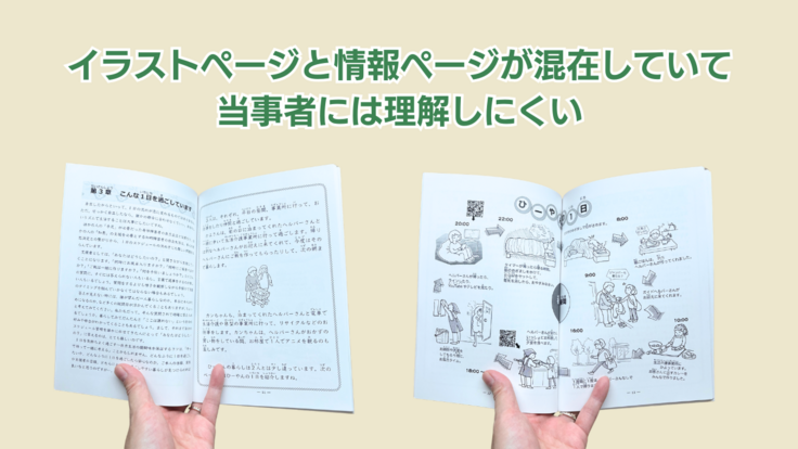 こうして見えてきた改善点を踏まえ、「もっと当事者本人が手に取りやすく、自分ごととして読める本にしたい」 そう強く思い、今回は、一人の生活を一冊でじっくり紹介する「絵本シリーズ」として再スタートすることを決めました。