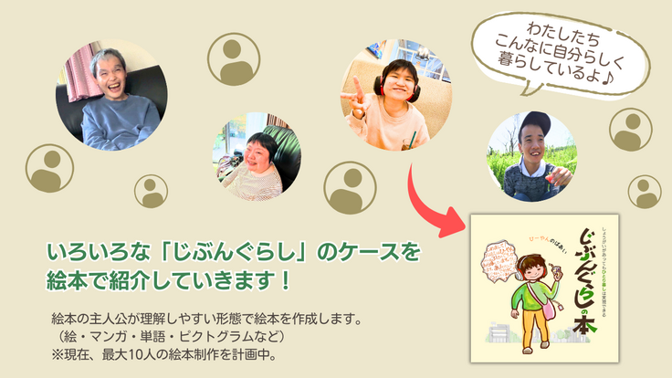 本プロジェクトでは、「支援つき一人暮らし=じぶんぐらし」をしている知的障害のある人たちの実際の暮らしを紹介する絵本シリーズを制作・出版します。