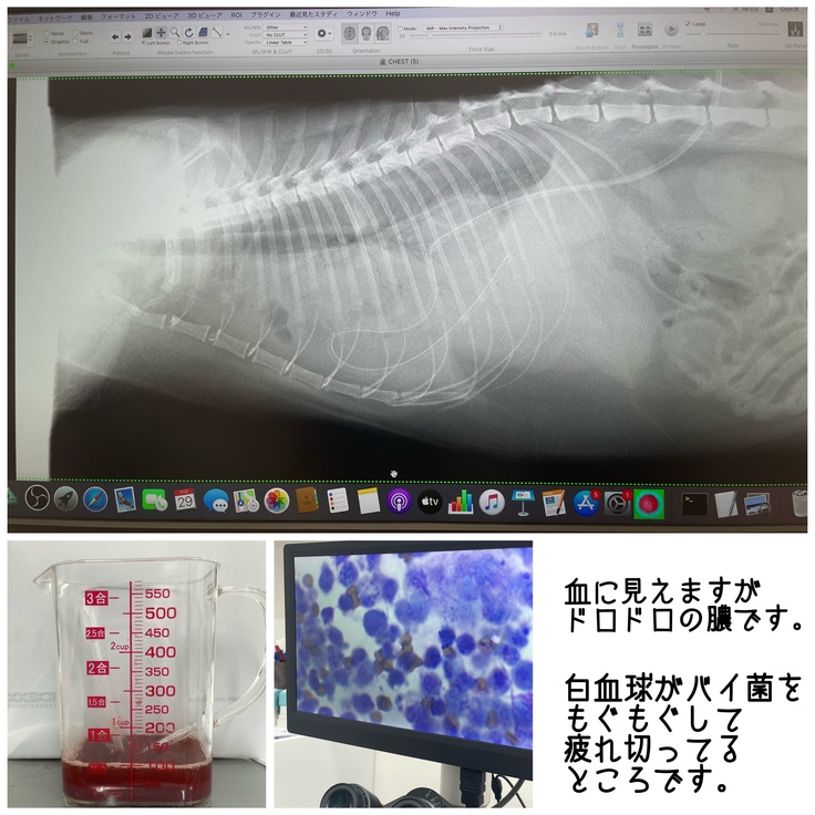(ドレーン手術後のレントゲン。胸水は膿水ということがわかり、生理食塩水で洗浄し薄めながら徐々に取り出すことに)