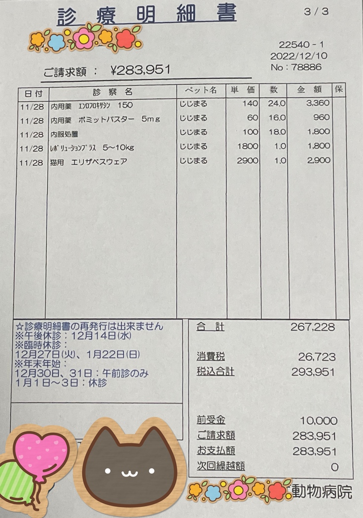 (12月現在の通院・投薬にかかった費用は12,320+22,176=34,496円でした。次は一月半ばに検査通院します。)