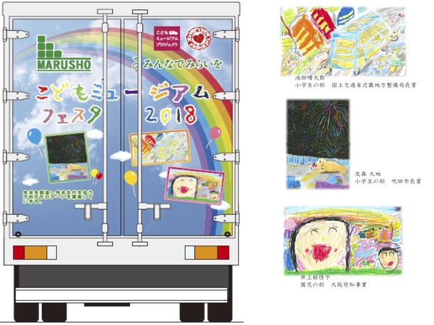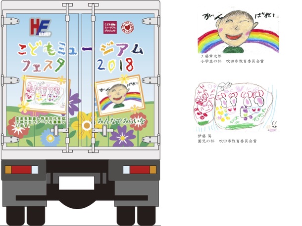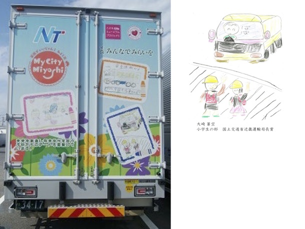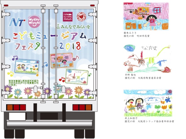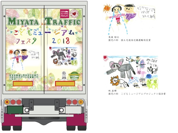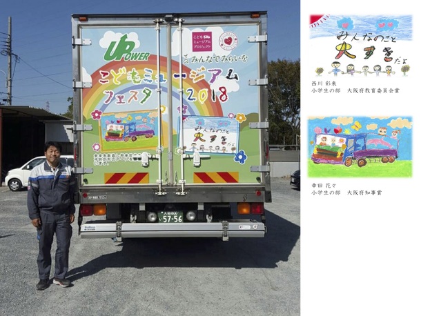 ■今回のプロジェクトでラッピングされたトラックと入賞したこども達の絵