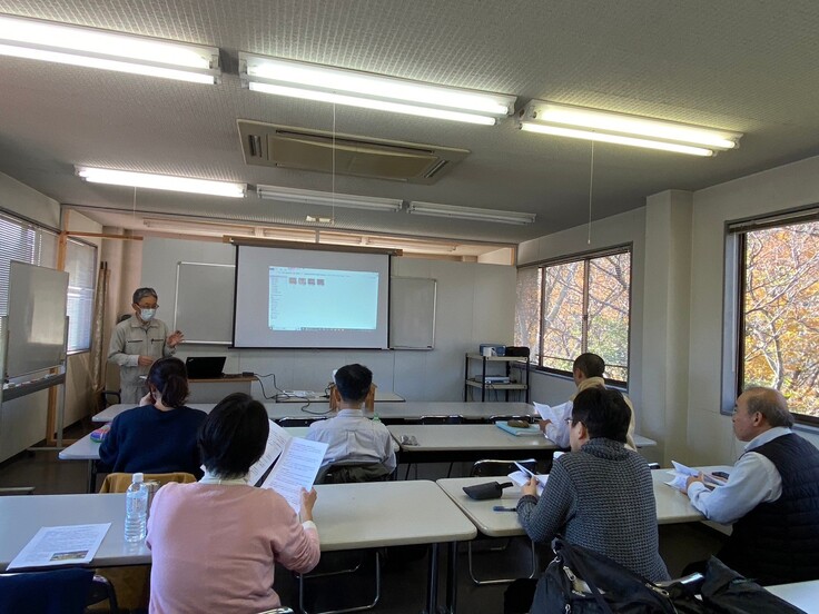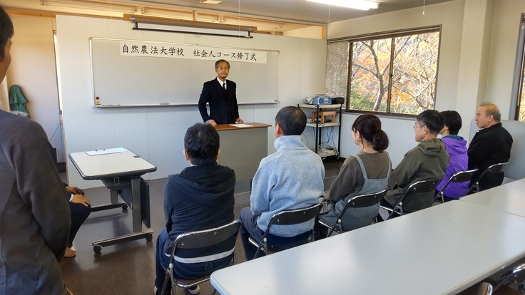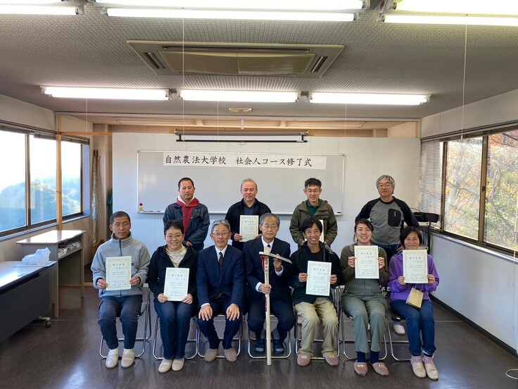 12月9、10日、令和5年度の社会人コースは最終回を迎えました。9カ月間なじんできた畑を収穫しながら片づけました。また「農業経営」の講義と、「自然農法の総括(復習)」の講義を行い、最後に修了式を行いました。校長から研修生に修了証をお渡しした後、一人ひとり、学びや感想を述べてくださいました。農業未経験から初めて野菜を作った感動、土に触れることが自然に近づく近道であると申し込んだ人、大仁農場の大自然に癒された人、等々。皆さんの中に歓びと感動があったようで、私たち職員も嬉しい限りです。修了後もお身体を大切に、それぞれの地で自然農法にお取組みください。最後に研修生から記念にと、サイン入りの鍬(くわ)をいただきました。ありがとうございました。