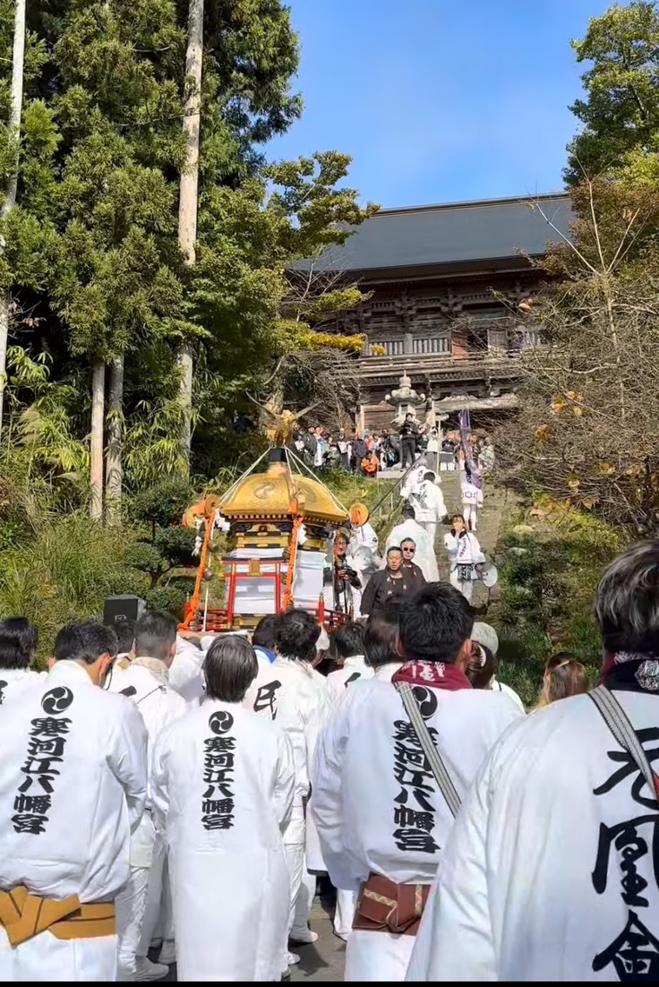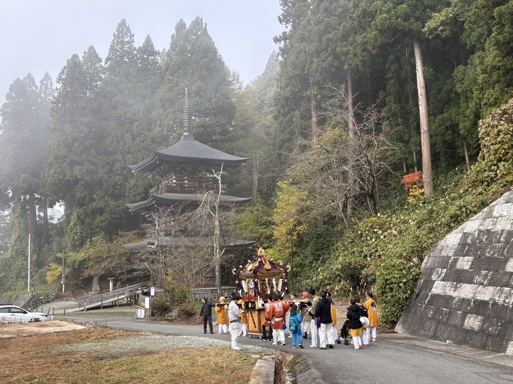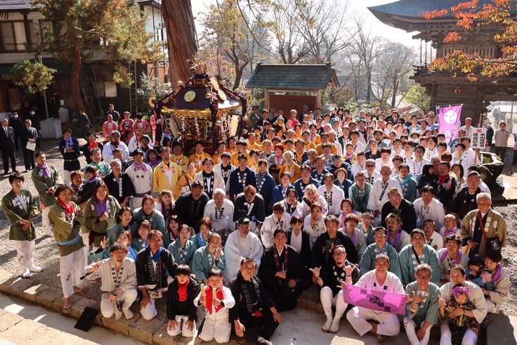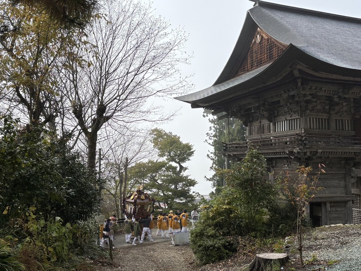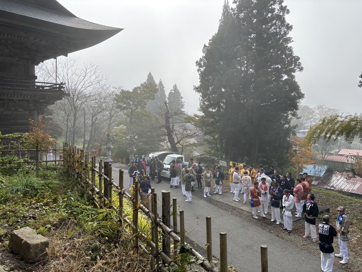 法要が営まれた後、おそらく慈恩寺の1300年の歴史の中で、初めての光景を慈恩寺旧境内にて目にすることができました。それは、寒河江神輿會の取り仕切りによる、寒河江八幡宮氏子神輿會、南部粋龍會、龍南會の、3基の神輿渡御です。慈恩寺本堂境内の西側に鎮座する熊野神社から3基の神輿がやってきました。中でも寒河江八幡宮の本神輿(通称六角神輿)は、熊野神社をいったん降りて下馬橋まで渡御をすると、最上院の表門前を通過し、山門までの長い階段を上ります。一山衆をはじめとした慈恩寺関係者の手拍子掛け声、そして太鼓の音が、本神輿の階段上りに挑む、担ぎ手に力を与えます。無事に階段を上った本神輿は三重塔へ向かい神輿を差してから、山門をくぐって境内への階段を更に上ります。このように神様も仏様も入り混じる、正に〝神仏習合〟の風景の中、にぎやかな境内はおそらく慈恩寺の歴史の中でも初めての盛り上がりを見せました。管長も恵比寿顔でした。神輿會會長もご満悦。担ぎ手もそれを見ている人達も、誰もが楽しく幸せな、とても素敵な時間でした。この時をみんなで過ごせたことも、先人が遺してくれた慈恩寺があったからこそだと感じました。