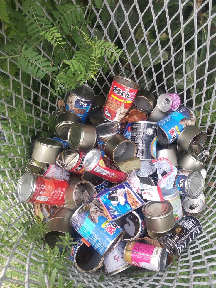 ごみ箱にはたくさんの猫缶の空き缶がありました