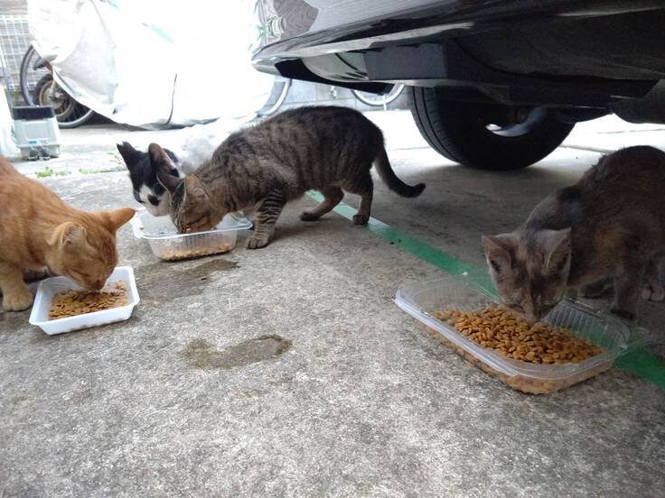 お腹を空かせている猫たちが複数いて ご飯をあげている