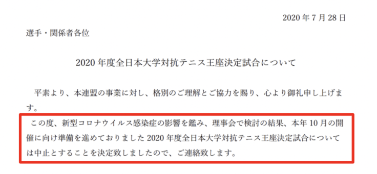 ・2020年10月に予定されていた、全日本学生テニス連盟主催の全⽇本⼤学対抗テニス王座決定試合(対象:大学生 / 団体戦)