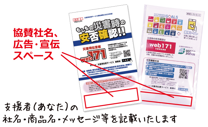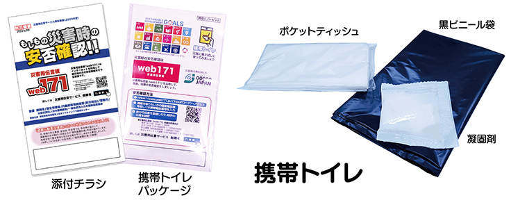 ご自身で備蓄して災害に備えて頂く、或いは家族や周囲の方へお渡し頂き、災害用伝言サービス及び携帯トイレの周知啓発にご活用頂くのも良いと思います。