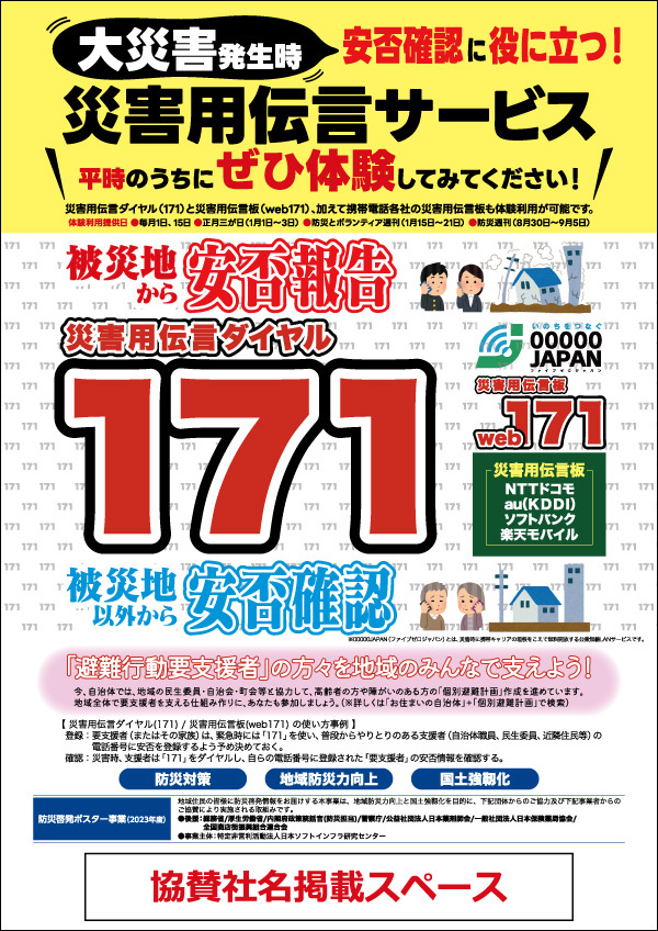 全国、約6万店ある薬局に、【災害用伝言ダイヤル(171) / 災害用伝言板(web171)】等の災害用伝言サービスを周知啓発するためのポスターを掲示。