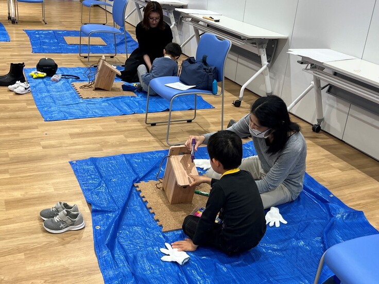 お子さんたちは初めて金槌やドライバーを握ったそうですが、巣箱が出来上がるにつれて釘を打つ作業も上手になっていきました。出来上がった巣箱にはお絵かきをして、世界に一つだけの巣箱の出来上がりです。