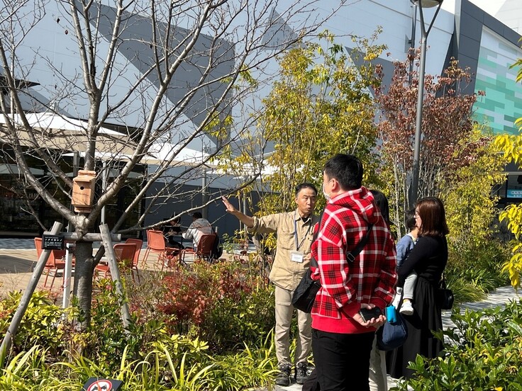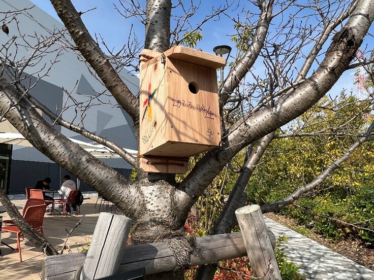 見本として作成した巣箱1つにみんなで寄せ書きをして、イオンモールの敷地内に設置しました。イオンモール土岐は昨年できたばかりの施設なのでまだ植栽された木は小さく、樹洞ができるまでには時間がかかりますが、このような巣箱を設置することでこれからの季節はねぐらとしても小鳥たちが利用してくれることでしょう。そして来年の春にはこの巣箱で子育てしてくれると期待しています。