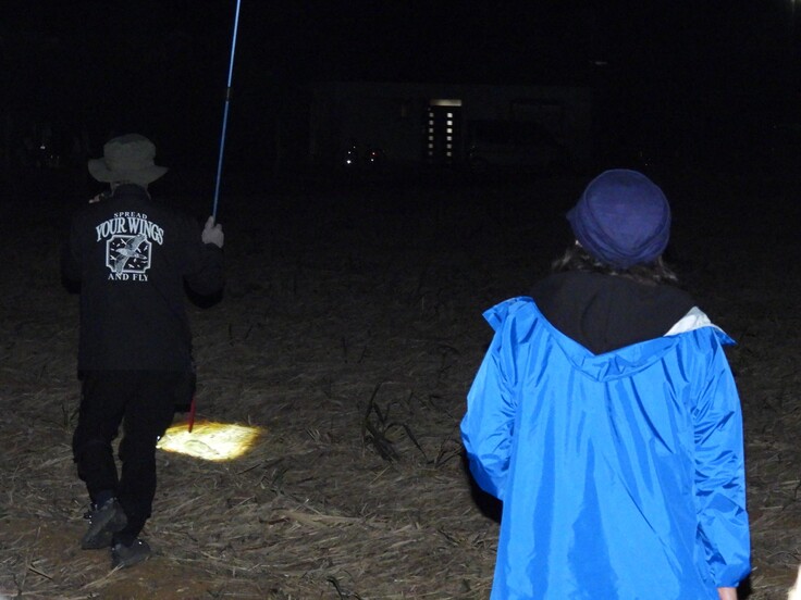 天候はまたしてもあいにくの寒波に見舞われ、気温が低く強風の中での調査となりました。夜間、山間部や農耕地を車で回り、3日間かけて島全域を調査しましたが、ヤマシギやコミミズク、オリイオオコウモリとは出会うことはできものの、肝心のアマミヤマシギの発見には至りませんでした。