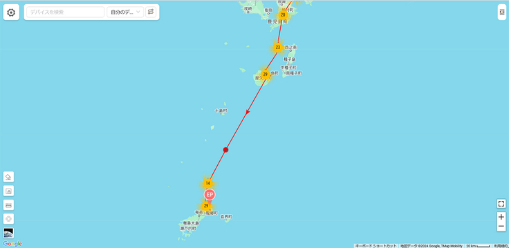 川上⑤が一番乗りで奄美大島到着です。捕獲地にピンポイントに戻ってきました!先行研究でもありましたが、成鳥個体だとやはり帰る場所も決まっているのでしょうか。行きも帰りも同じ8日間の旅路でした。とはいえ、この後また動き出すかもしれませんが、ひとまずご報告です。