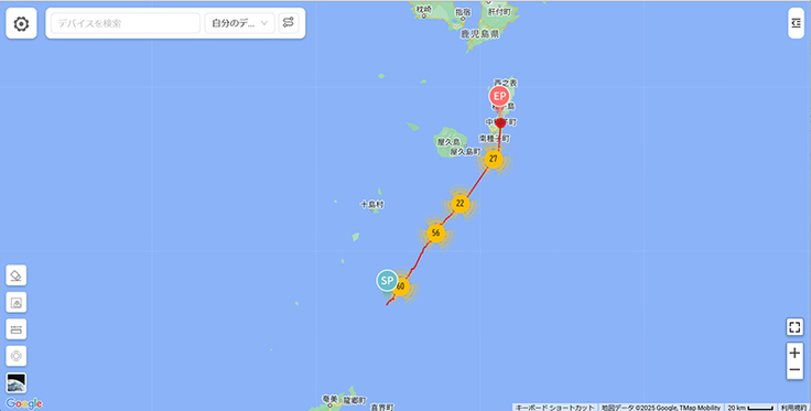 2024年に装着した龍郷小個体2周目の旅立ちが始まりました!3月21日に奄美大島を離れたようです。バッテリーの充電が溜まってからデータが蓄積され始めたので、旅立ちの瞬間はデータが取れていませんが、何とか元気に飛び出してくれたようです。