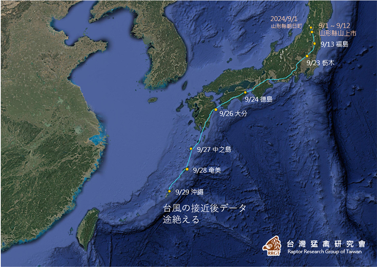 台湾は、サシバにとって春と秋の渡りの重要な中継地です。これまでの調査で、多くのサシバが韓国や中国東北部から飛来してフィリピンに向かうルートを取っていることが分かっています。しかし、日本から出発し、台湾を経由するルートについては、可能性はあるとされながらも、具体的な証拠が不足していました。これまでの追跡データでは、南西諸島までしか到達しない例が多く、仮に台湾の近くまできたとしても、連続的なデータではなく断片的で、中途半端な記録に留まっていました。 そんな中、昨年、ある個体が私たちに新たな希望をもたらしました。