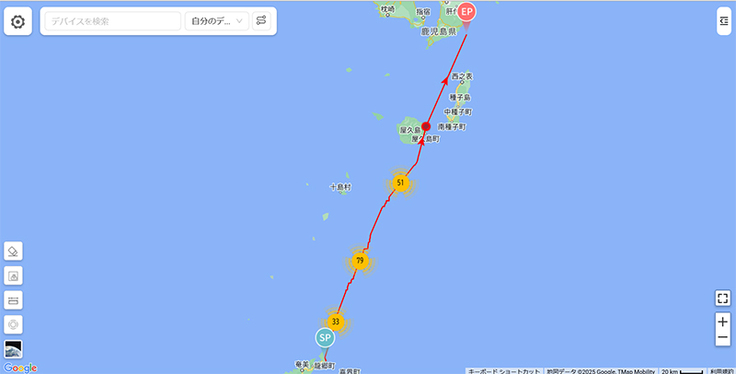 23日の報告で出発したかもしれないとお伝えしていた宇宿①はやはり2周目に入りました。三鳥屋は順調に進んでいますが、先に出発した龍郷小はデータが入ってきていません。