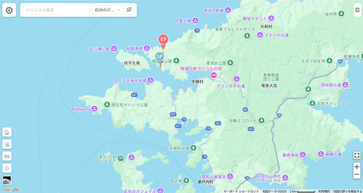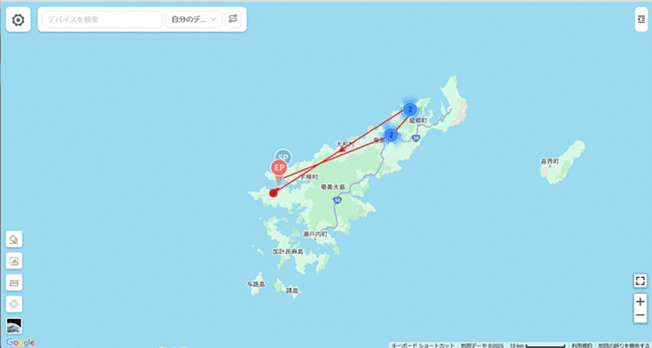 宇検組もツムグと生勝①が動き出しました!生勝①は地図上ではほとんどわからないぐらいの動きですが、捕獲地から離れたのですでに移動していると思われます。ツムグも龍郷のほうまで線が伸びていたので、やったぁと思ったのですが、よく見ると線の終点は捕獲地??あれっと思って複数日のデータで見てみると、どうやら4月5日に飛び出したものの、奄美大島北部で泊った後、また捕獲地へ戻ってきたようです。ただ、今日の9時現在では、少しですがそこからさらに移動をしているので、また動き出したのではないかと思います。こういうこともあるのですね(苦笑)