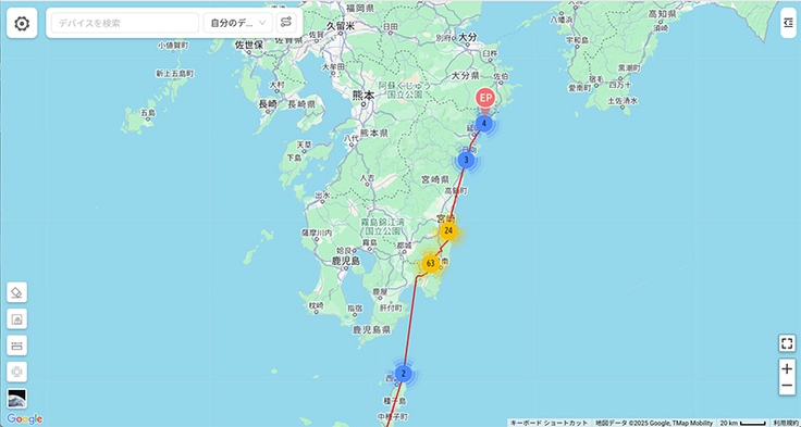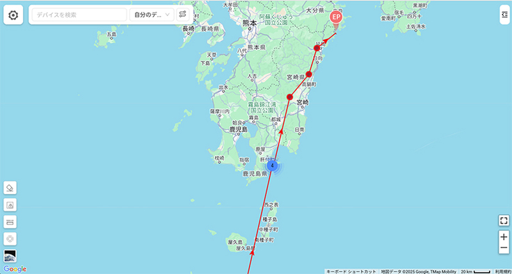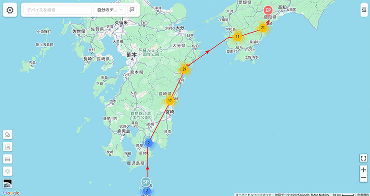 コテツと生勝③が昨日と同じ場所にいますね。目的地に到着したのでしょうか?もう少し様子を見たいと思います。生勝②も動きません。こちらも目的地に到着した可能性が高くなってきました。ツムグはデータが届かないので、林の中など電波が届きにくい場所にいるのかもしれませんね。川上②はまだ四国ですが、ほとんど動いていません。どうなるか楽しみです。