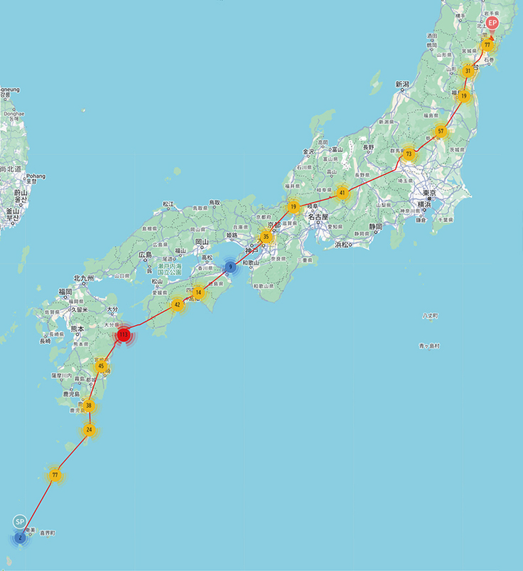部連①は宮崎に入りましたが、3日間で70kmほどしか進んでいません。ずいぶんとゆっくりです。