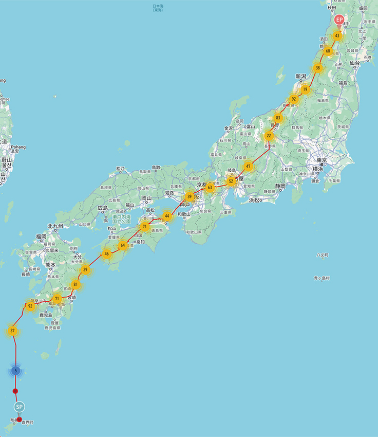 川上①は京都、滋賀、三重の県境を移動して名古屋方面に進んでいます。このまま太平洋に沿って移動でしょうか。