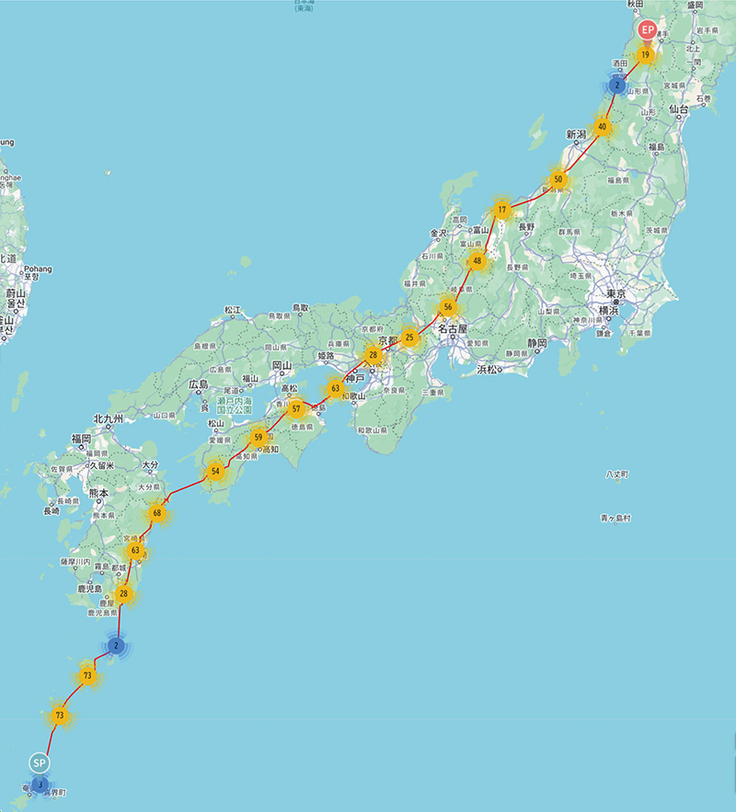 川上②は4月21日を最後にデータが来ていませんが、去年の繁殖したと思われる場所のすぐ近くまで戻ってきていたので、目的地に到着後、おそらく森に入り太陽光が当たらなくなって充電不足になっているのかと思います。よって到着したものとしてまとめました。去年は4月11日に出発して4月27日到着。16日間の旅路でしたが、今年は4月9日に出発して4月21日到着。昨年より早く12日間で到着したと思われます。去年と比べると、アルプス周辺など所々違う場所はありますが、おおむね同じルートに見えます。今頃子育ての真っ最中かもしれません。