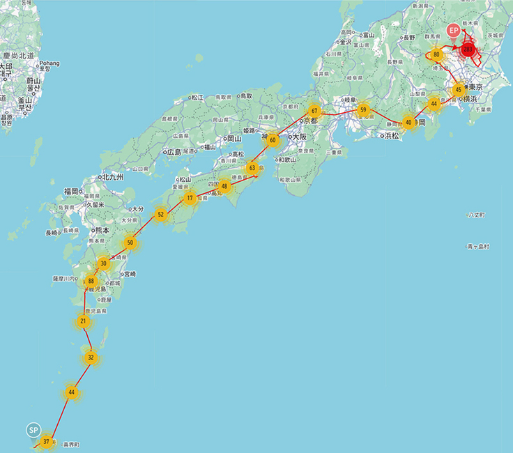 最後の名柄も1週間、ウロウロはしていますが栃木県から動かないので、到着としておきたいと思います。名柄は4月29日に移動を開始したものの、奄美大島北部の笠利にしばらく滞在し、5月13日に奄美大島を離れました。途中、筑波で滞在かと思われましたがまた移動し、6月6日、現在とどまっている栃木県まで移動しました。移動開始から計算すると38日間、離島してからだと24日間の旅路でした。のんびりした移動ですね。また動き出したらご報告します。