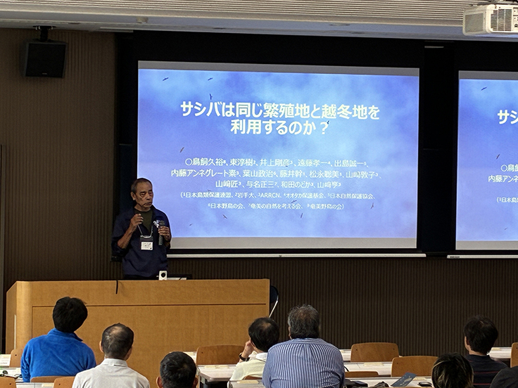 学会では2テーマ発表しました。渡りルートと繁殖地、越冬地に関するものを奄美野鳥の会の鳥飼久裕さんが口頭発表で、奄美大島のサシバの性比に関する発表をアジア猛禽類ネットワークの内藤アンネグレート素さんがポスター発表しました。