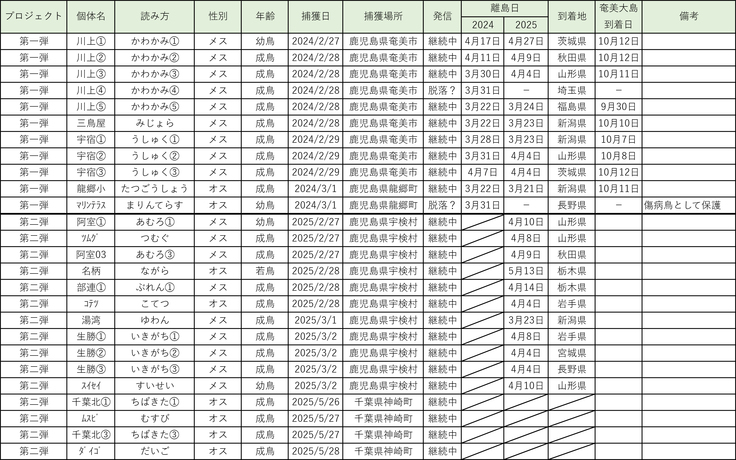 これまでにGPSタグを装着し追跡している個体の簡単な情報をまとめてみました。速報で流れる個体の情報として参考になれば幸いです。