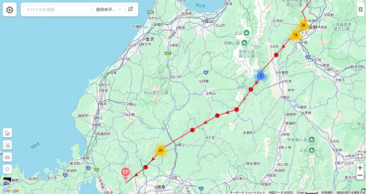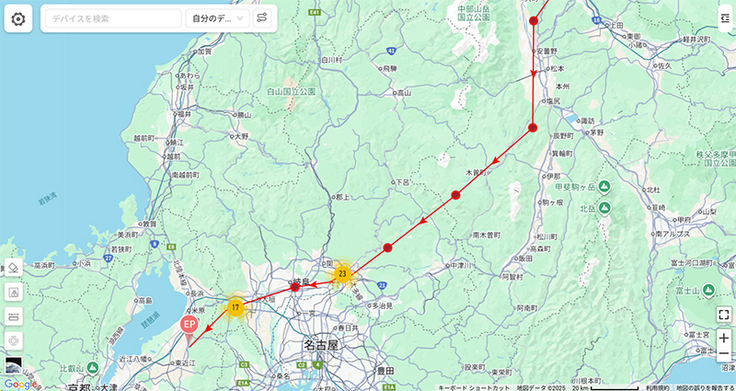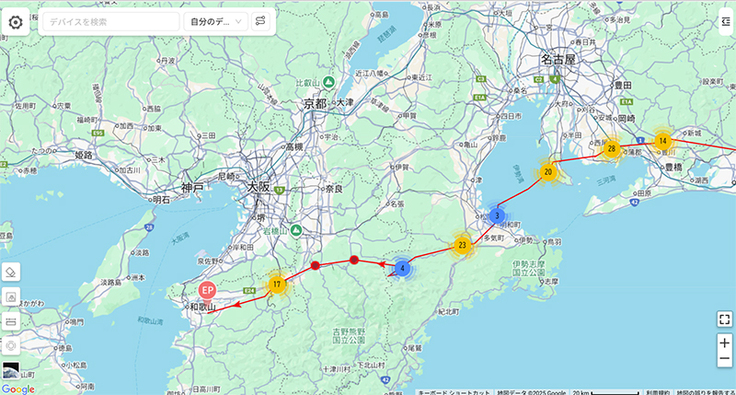 生勝③が久々に動き出しました。9月22日から10月7日まで同じ場所に15日間滞在していたので、一応京都府のこの場所を中継地として記録しました。赤く120と示されているあたりです。