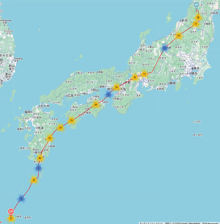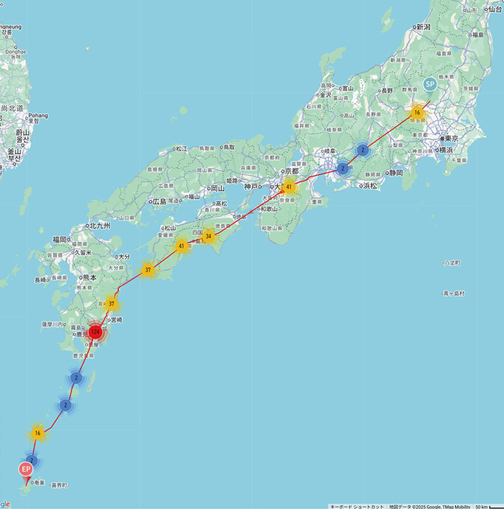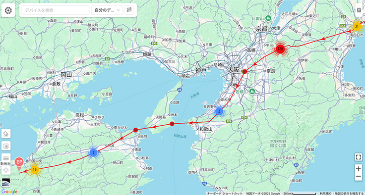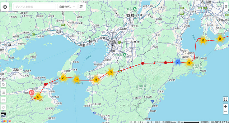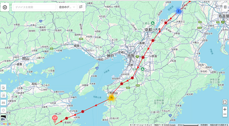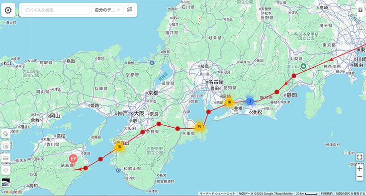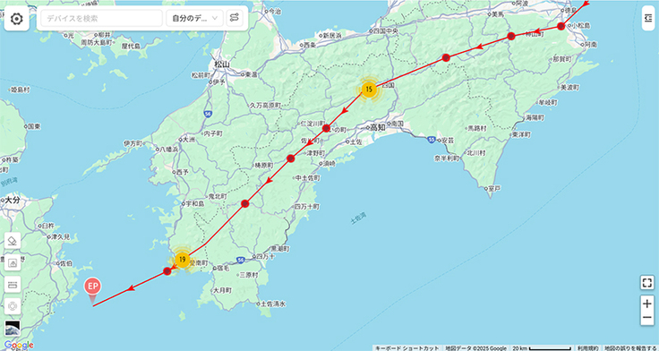 同じく千葉組のムスビはしばらくデータが来ていませんでしたが、既に四国に入っています。ここまでゆっくりとしてペースですが、ここから勢いに乗りそうな予感がします。