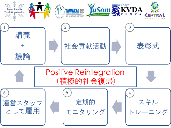 回数を重ねるにつれて、ソマリア人若者ギャングの社会復帰実現に向け、より多くのアクターを巻き込んで包括的に実施することや、多くのギャングを複数回プロジェクトに参加させることの必要性が強く意識されるようになりました。そして、これらの気付きをもとに、「意識改革」と「スキルトレーニング」の両面をさらに充実させ、回数を経るごとに社会復帰の意志を強めていけるようにしたのが、現行のプロジェクト体系です(以下サイクル図)。