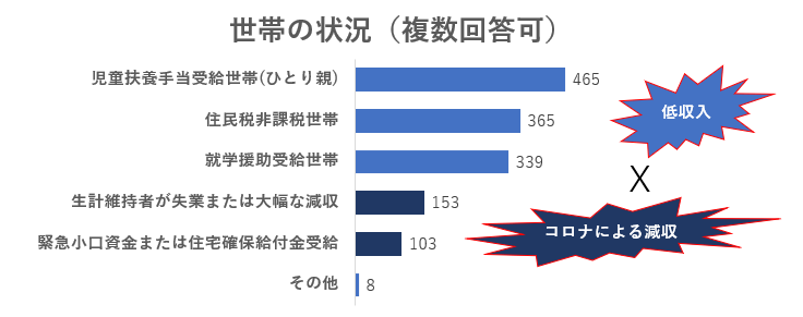 昨年の受験サポート奨学金に応募いただいた44都道府県からの606名のうち、83%がひとり親世帯、82%が年収300万円未満の世帯でした。このような低所得家庭は、コロナ禍で所得が激減したり、職を失ったりと、さらなる厳しい状況に置かれています。