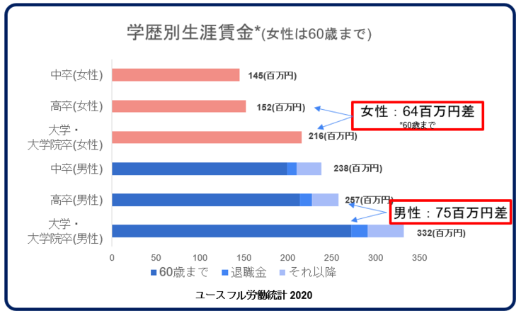 そして生涯賃金で見ると、男性は大卒と高卒で約7500万円の差があり、さらに女性の生涯賃金は男性の6-7割と、女性ひとり親の貧困率が高い要因となっています。