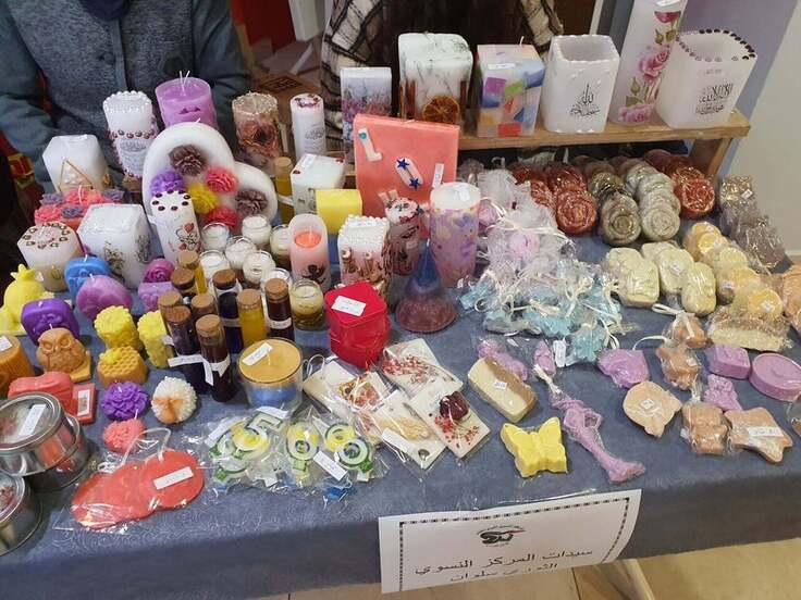 続いて進んでいくと、「キャンドル・石鹸づくり」研修に参加した女性たちに出会えました。見た目も香りも素敵で、押し花などの装飾がキャンドルの中に入っているものもあり、製作者の様々な工夫が見られました。