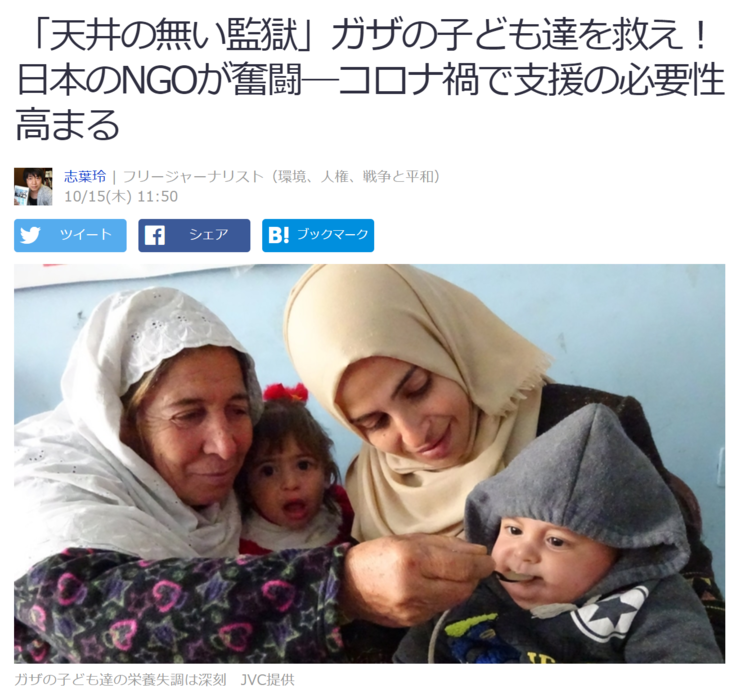 JVCもとてもお世話になっており、私も「帰還のための大行進」の取材のために志葉さんが現地に来られていた際、エルサレム旧市街の近くでお話をさせていただきました。記事ではガザの現状とJVCガザ事業の活動、そして本クラウドファンディングの取り組みについて触れられています。
