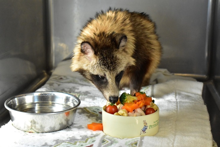 後ろ足が無いホンドタヌキのチャリンさんは、どうやらニンジンが好きなようで、お肉の次にパクパクと食べていました💓