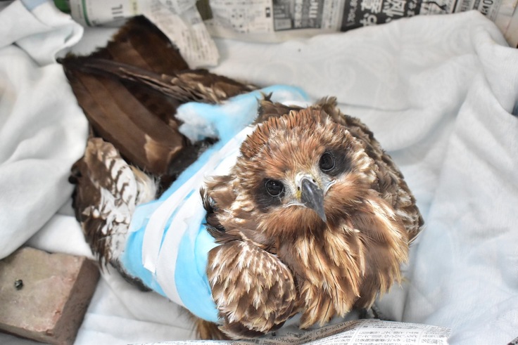 幸い、保護されてきたトビは幼鳥とは言え、全長約 50 cmと、ハシブトガラスの成鳥より二回り程大きな体であることと、病院到着時の容体が非常に落ち着いていたことから、麻酔や手術に耐えられると判断し、急遽、その日に手術を行うことになりました。