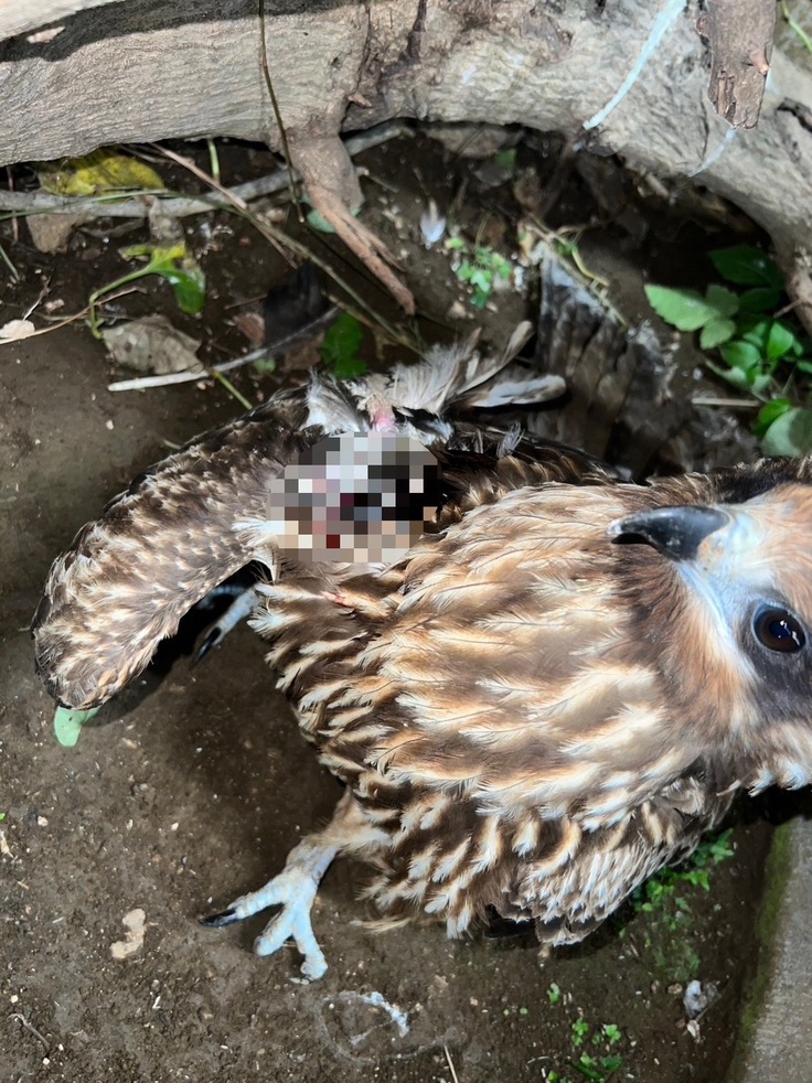 しかし、翌日の夕方、2回目の餌をあげに行くと、地面に疼くまるトビの姿がありました。