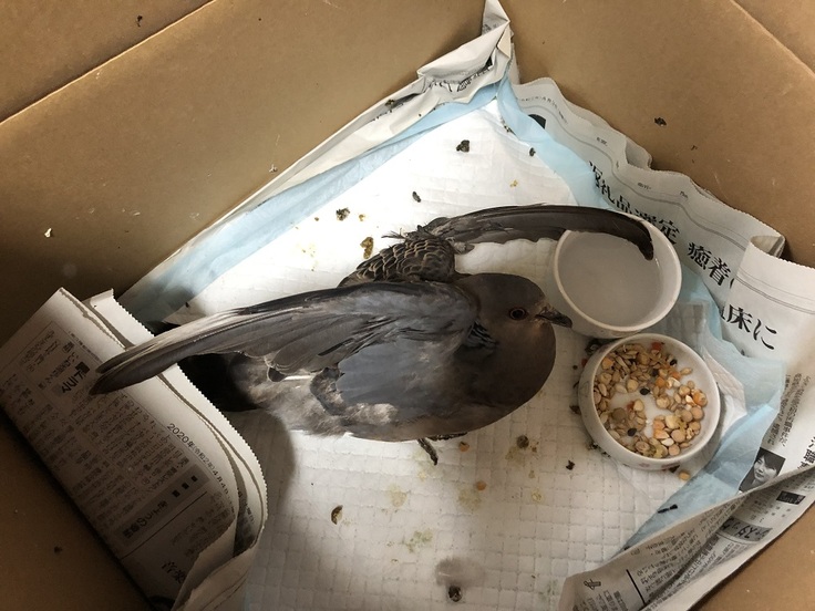 ○ネコに襲われ左翼と左脚を骨折したキジバト