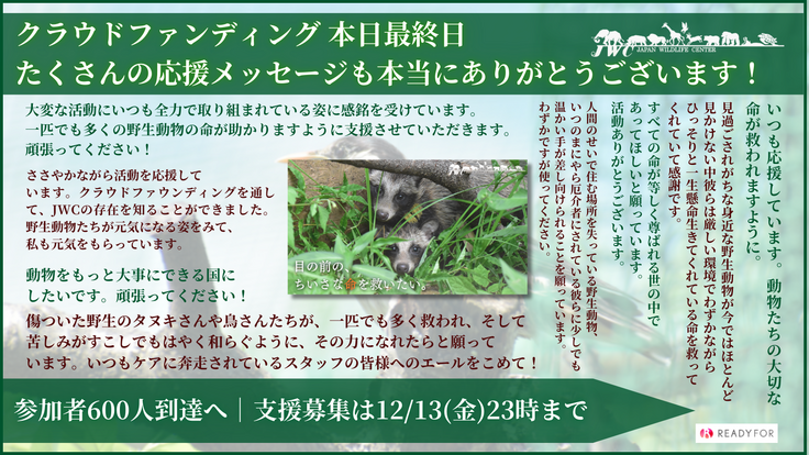 毎月定額でご支援させて頂いており、メールで活動のご報告を拝見させていただいております。その活動ですらとても感銘を受けているのに、さらにもっと沢山の野生の子たちを助けることができるとのことで更に応援したいと思いました。本当に微力ではありますが、協力させてください!いつも本当にありがとうございます。これからも野生の子たちのためにどうぞよろしくお願いいたします。スタッフ様も、時節柄どうぞご自愛くださいませ。