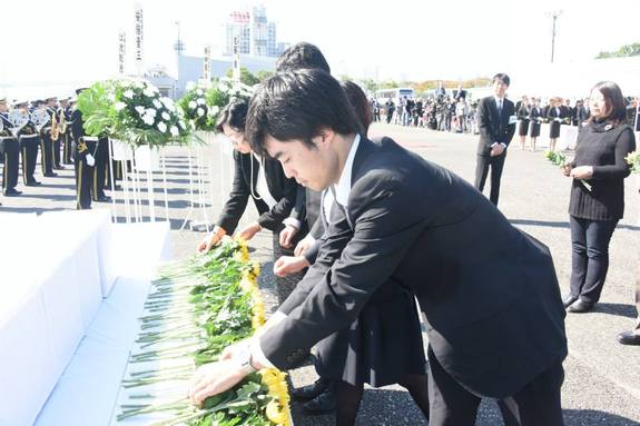 (海上自衛隊が晴海埠頭に接岸し、式典に参列し献花を行う隊員)