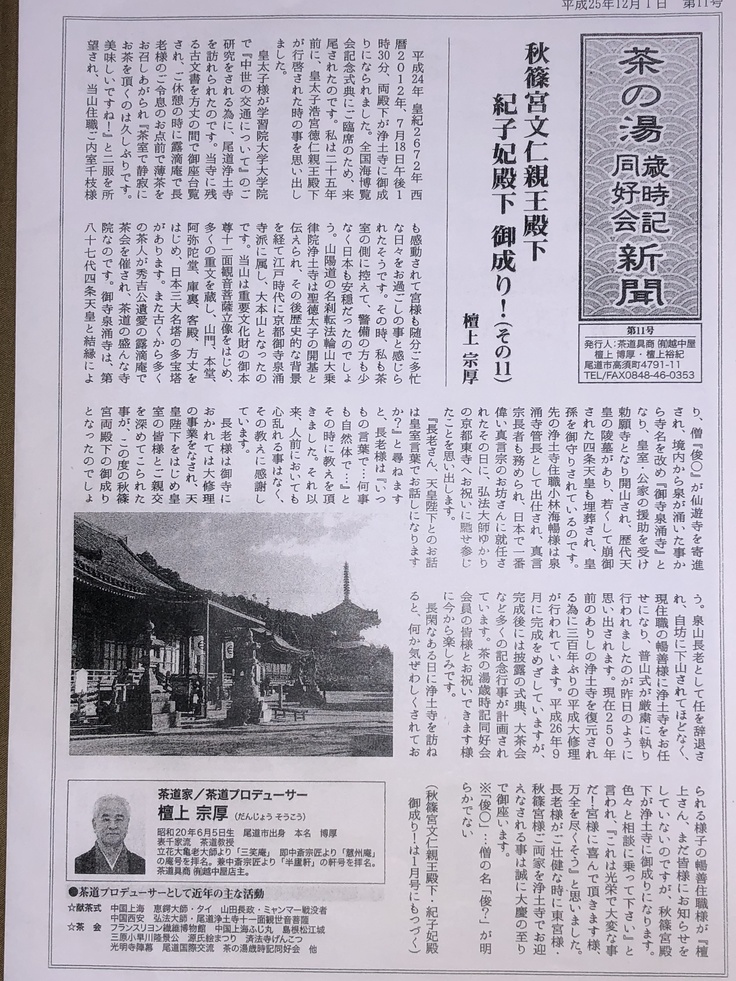 国宝の寺浄土寺は、皇室ゆかりの御寺泉涌寺派の寺院でございます。先代の小林海暢長老は、泉涌寺派管長と同時に、真言宗長者も勤めさせて頂きました。そういったご縁もございまして、今上天皇陛下(浩宮皇太子殿下の時代)や秋篠宮両殿下も浄土寺を行啓訪問なさいました。皇室の方々とも縁が深うございます。当時の茶の湯歳時記同好会新聞からもその熱気が伝わってきます。尾道に立ち寄られた際は、浄土寺に足をお運びくださいませ。クラウドファンディングへのご支援、宜しくお願い申し上げます。
